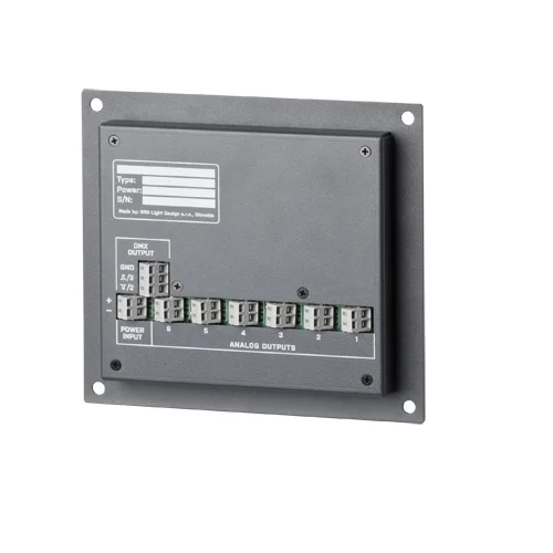 Het bedieningspaneel 6-12-18-kanalen is verkrijgbaar in vier verschillende types met naar keuze 6, 12 of 18 kanalen. Het is een klein en licht DMX-bedieningspaneel voorzien van een DMX en 0-10V analoge output. De voordelen van deze DMX-bedieningspanelen (en tevens unieke features) zijn de zeer geringe inbouwdiepte van 25mm, de eenvoudige bediening, het lage stroomverbruik en de WAGO-connectoren, waardoor dit DMX-bedieningspaneel makkelijk te installeren is. Uitvoeringen: