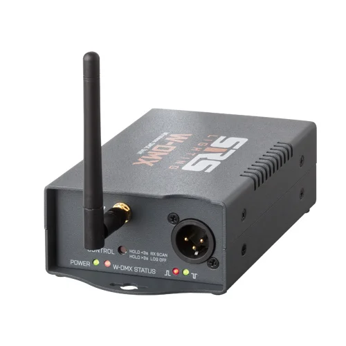 De draadloze DMX-zender van SRS Light is voorzien van XLR-uitgang en een geschakelde voeding, waardoor de netspanning mag variëren tussen 85V en 265V. Er zijn diverse antennes verkrijgbaar voor het vergroten van het bereik. Het draadloos DMX van SRS Light maakt gebruik van de FHSS-standaard. Deze benut 83 discrete frequentiekanalen en checkt elke milliseconde naar een storingvrije verbinding. Daardoor is de draadloze DMX zeer betrouwbaar. Hiervoor hoef je niets extra’s te doen. Je hoeft de dimmerbar maar één keer te koppelen met de draadloze DMX-zender. De zender heeft een LumenRadio module.