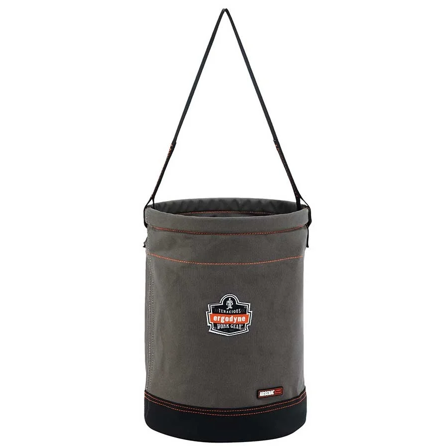 Ergodyne canvas emmer met lederen bodem; 24oz canvas; Sterke geweven band; max. last 68kg; 12,5"D x 17"H/ 32cm x 43cm; grijs