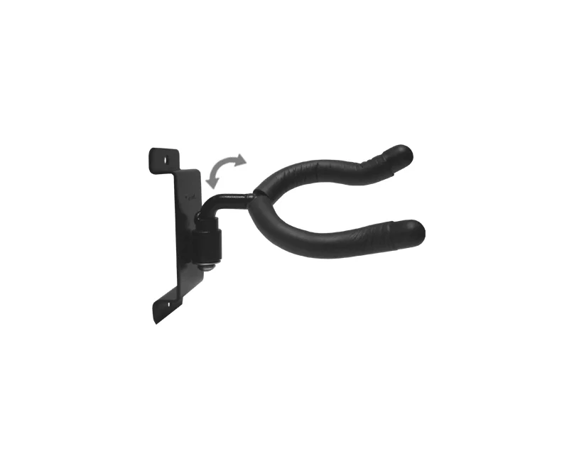 Deze praktische gitaarhanger, gemaakt van staal en afgewerkt met zwarte, krasbestendige verf, heeft met zacht rubber beklede steunarmen om de gitaar te beschermen.