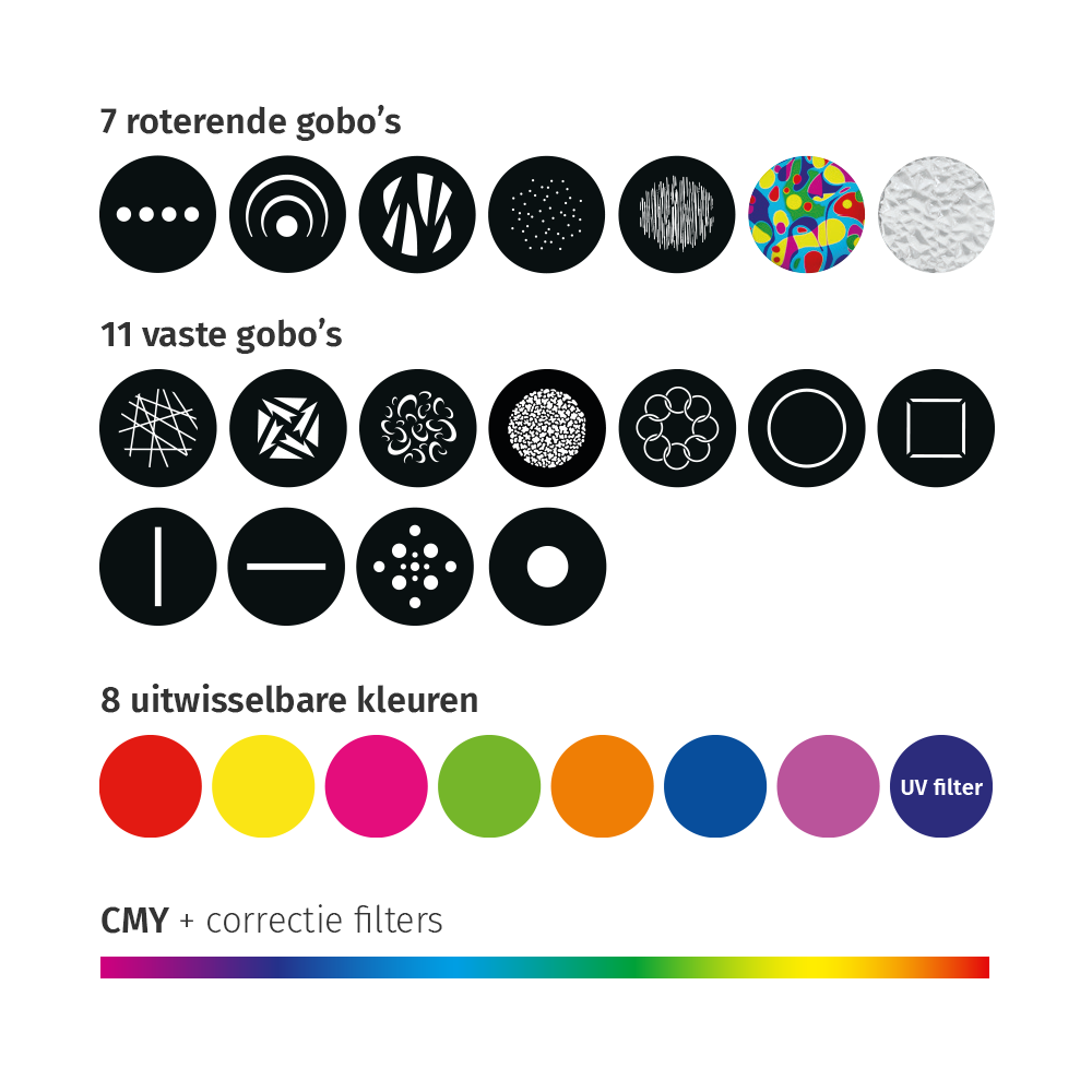 Gobos: 1 wiel met 11 statische en 1 wiel met 7 roterende gobos
