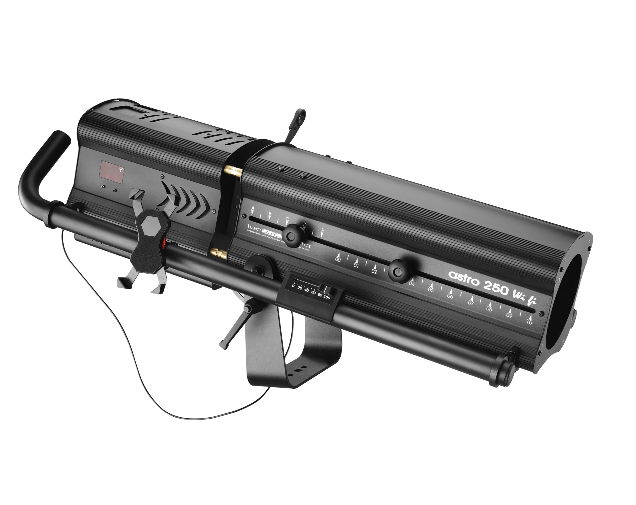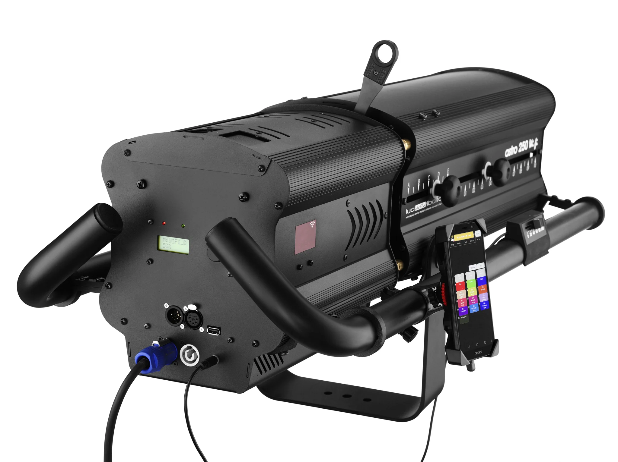 Stijlvolle, compacte en uiterst effici‘nte RGBW led followspot waarvan de unieke eigenschappen een uiterst precieze en gebruiksvriendelijke bediening in elke situatie mogelijk maken. - Kleur controle door Android of IOS mobiele apparaat via zelf gegenereerde wi-fi eigen zone (1 apparaat alleen, 12m bereik) of op afstand DMX512-RDM - USB-poort meegeleverd om uw mobiele apparaat op te laden terwijl u de followspot bedient - Klem op universele mobiele telefoon houder, 3,5/6.5in, 360¡ draaibaar, geleverd - Klem op digitale dimmer, positioneerbaar langs de zijbalken om aan de behoeften van elke operator te voldoen, geleverd - Android mobiele telefoon, met vooraf geladen eigen kleurenbibliotheek, op aanvraag - Gratis eigen kleurenbibliotheek beschikbaar om te downloaden van onze website voor degenen die een eigen mobiel apparaat gebruiken.