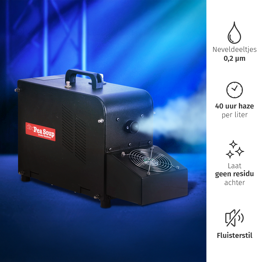 De kracht van de Phantom zit in de precisie. Met een deeltjesgrootte van slechts 0,2 micron produceert deze hazer een vrijwel onzichtbare nevel die pas zichtbaar wordt wanneer licht erdoorheen schijnt. De techniek achter deze fijnmazige mist maakt het verschil: het zorgt ervoor dat de haze zich egaal verspreidt in de ruimte zonder storende ophopingen. Dit maakt het ideaal voor het accentueren van lichtbundels, lasers en andere visuele effecten zonder de ruimte te vullen met grote dampwolken. Daardoor blijft je scène zuiver, gecontroleerd en esthetisch aantrekkelijk.
