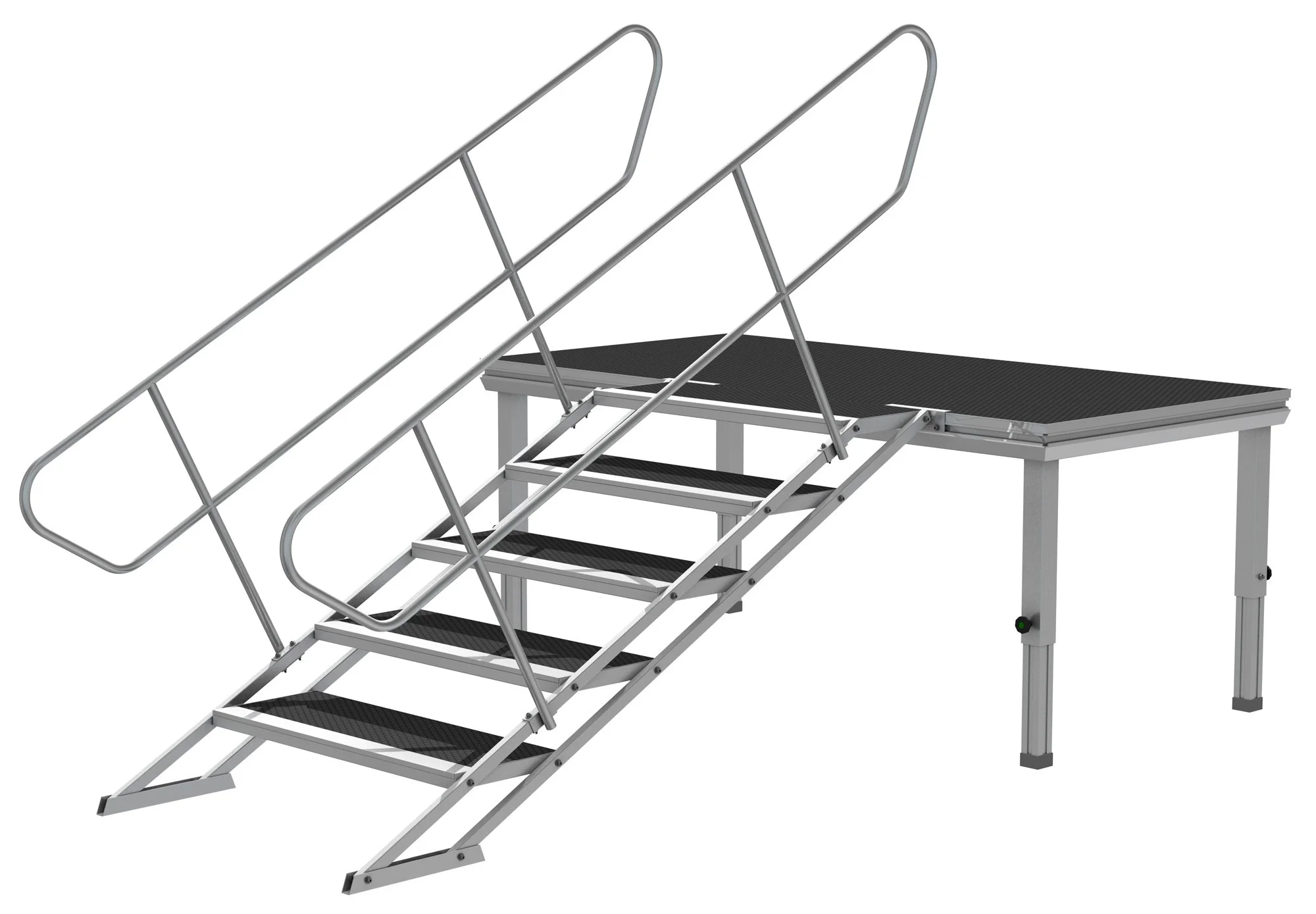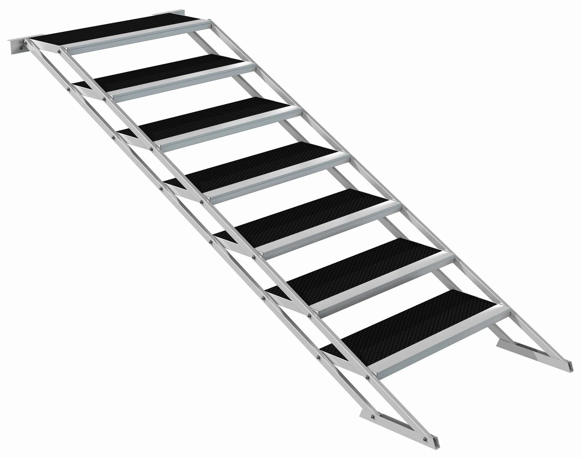 Verstelbare trappen zorgen voor een snelle en vlotte montage. Ze zijn gemaakt van zware stalen profielen. De treden zijn gemaakt van multiplex en hebben onze speciale "Hexa" antisliplaag voor maximale grip, waardoor ze geschikt zijn voor zowel binnen als buiten.