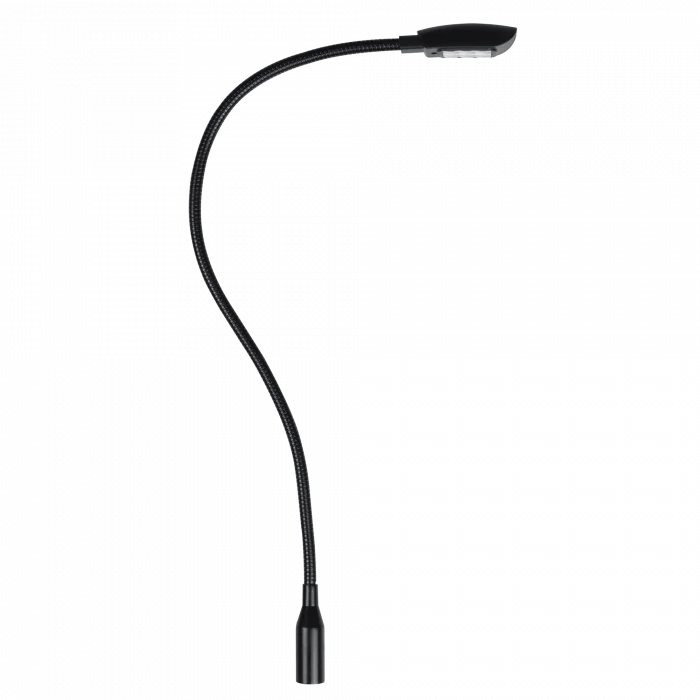 6 RGBW COB LEDs, met een kleurtemperatuur van 6000 tot 6500K. De zwanenhalslamp, totale lengte 450mm, heeft een XLR 3-PIN aansluiting. De LEDs zijn dimbaar (door externe apparaten zoals mengtafels en lichttafels).