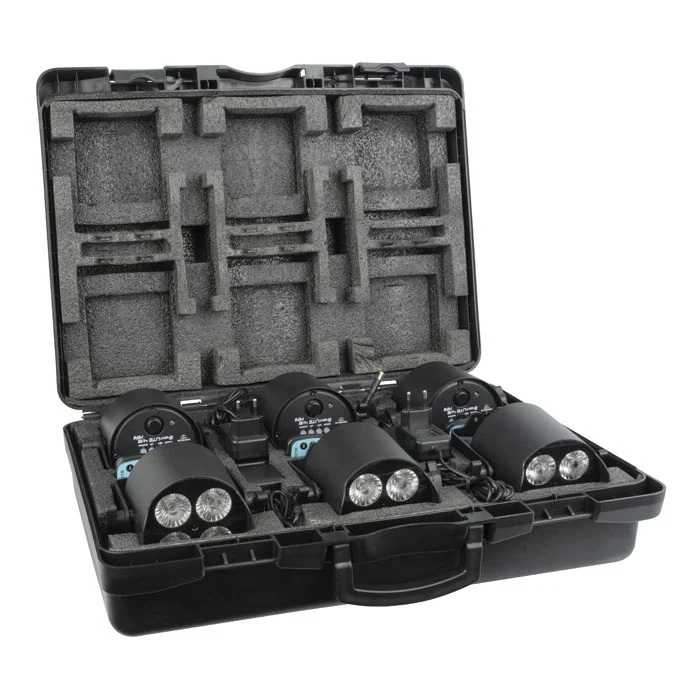De Showtec EventLITE 4/8 Mini Set bevat 6 Showtec EventLITE 4/8 Mini IP65 mobiele fixtures in een stevige op maat gemaakte koffer. Met deze set heb je een zeer draagbare en mobiele sfeerlichtinstallatie tot je beschikking die perfect is voor buiten- en binnendecoraties. De lichtgewicht minispots kunnen tot 11 uur branden op één kleur (max. 4 uur op volle sterkte) en creëren zeer indrukwekkende kleuren met hun 8-watt RGBW LED-lichtbron. Er worden twee IR-afstandsbedieningen meegeleverd om de EventLITE 4/8 Mini op afstand te bedienen en er worden ook zes opladers voor de EventLITE 4/8 Mini meegeleverd.