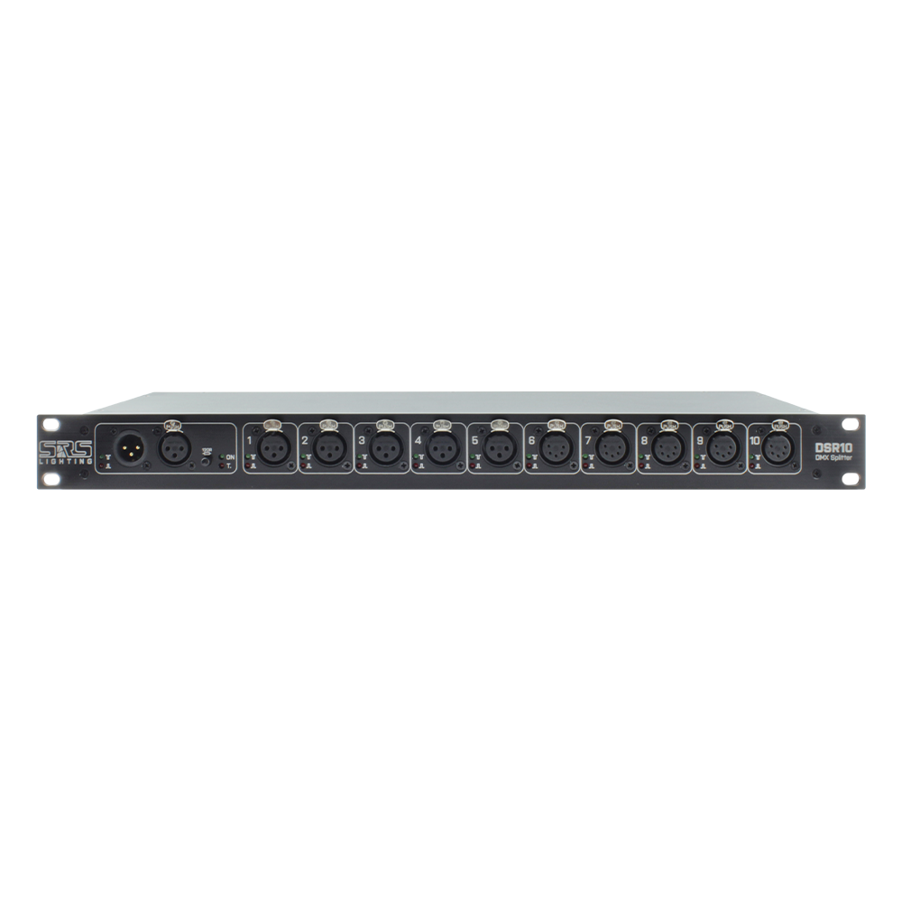 SRS Lighting | DSR10 | DMX-splitter 10-kanaals | Input: 3PIN | Output 5x 3PIN 5x PiN | 19-inch | Power input: Powercon